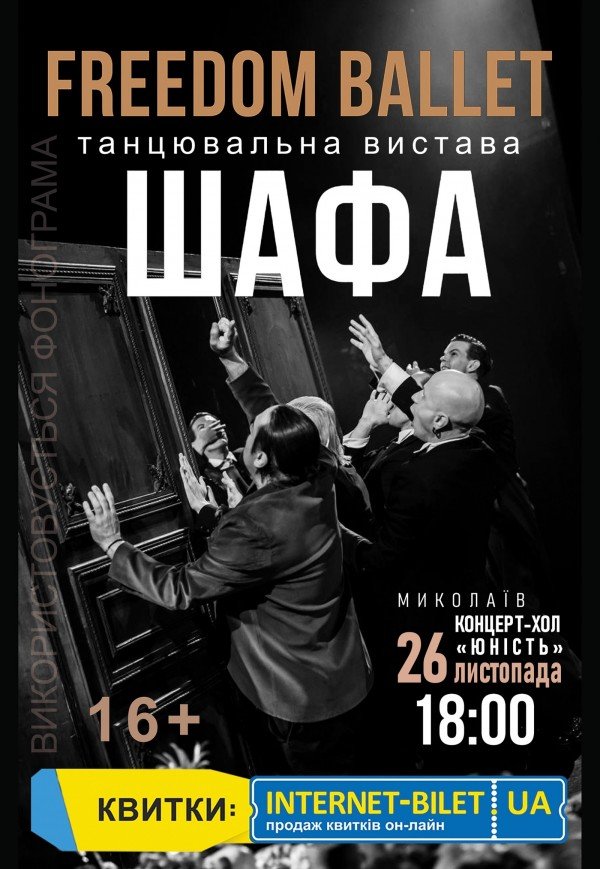 Freedom Ballet. Танцевальный спектакль "ШКАФ" состоится 26 ноября 2025, 18:00, среда в Концерт-холл «Юность». С помощью сервиса internet-bilet.ua, Вы сможете с легкостью забронировать, заказать и купить билеты на интересующий Вас концерт, спектакль, оперу, балет, мастер-классы, спортивные и детские мероприятия, оплатив их самым удобным для Вас способом: через интернет банковской картой VISA/MasterCard, наличными или курьером, если сделаете заказ билета c доставкой.
